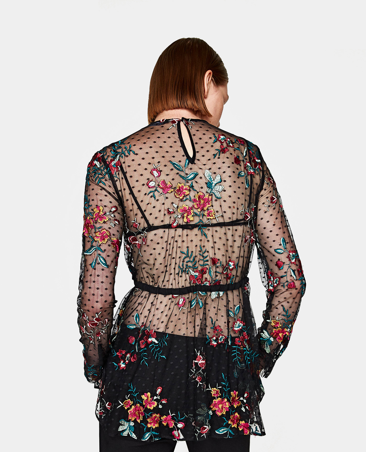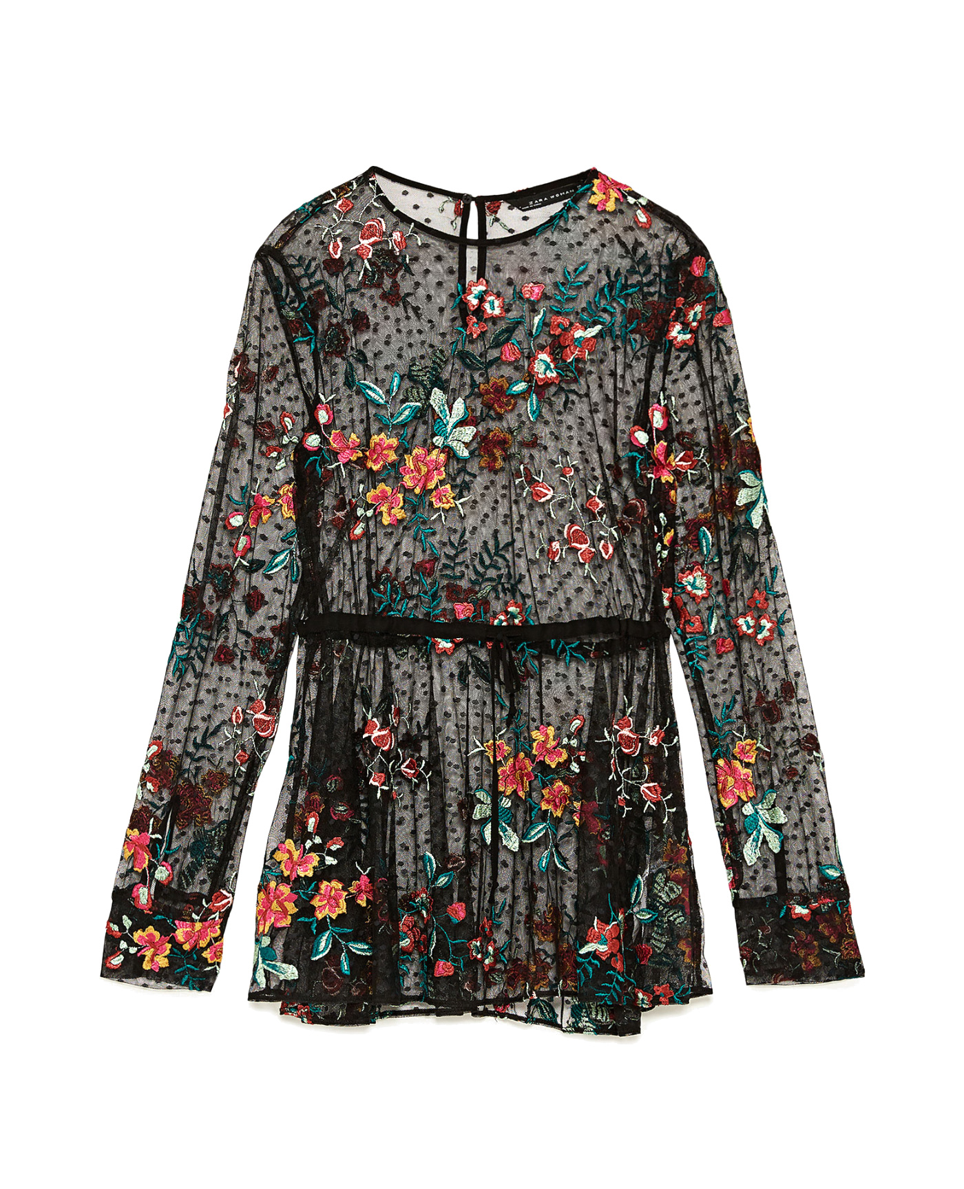 Shift dress from Ganni in Total Eclipse. Allover floral print. Round neckline. Concealed back zip closure. Long sleeves with black piping at cuff. Straight hem. Unlined. Casual fit.
